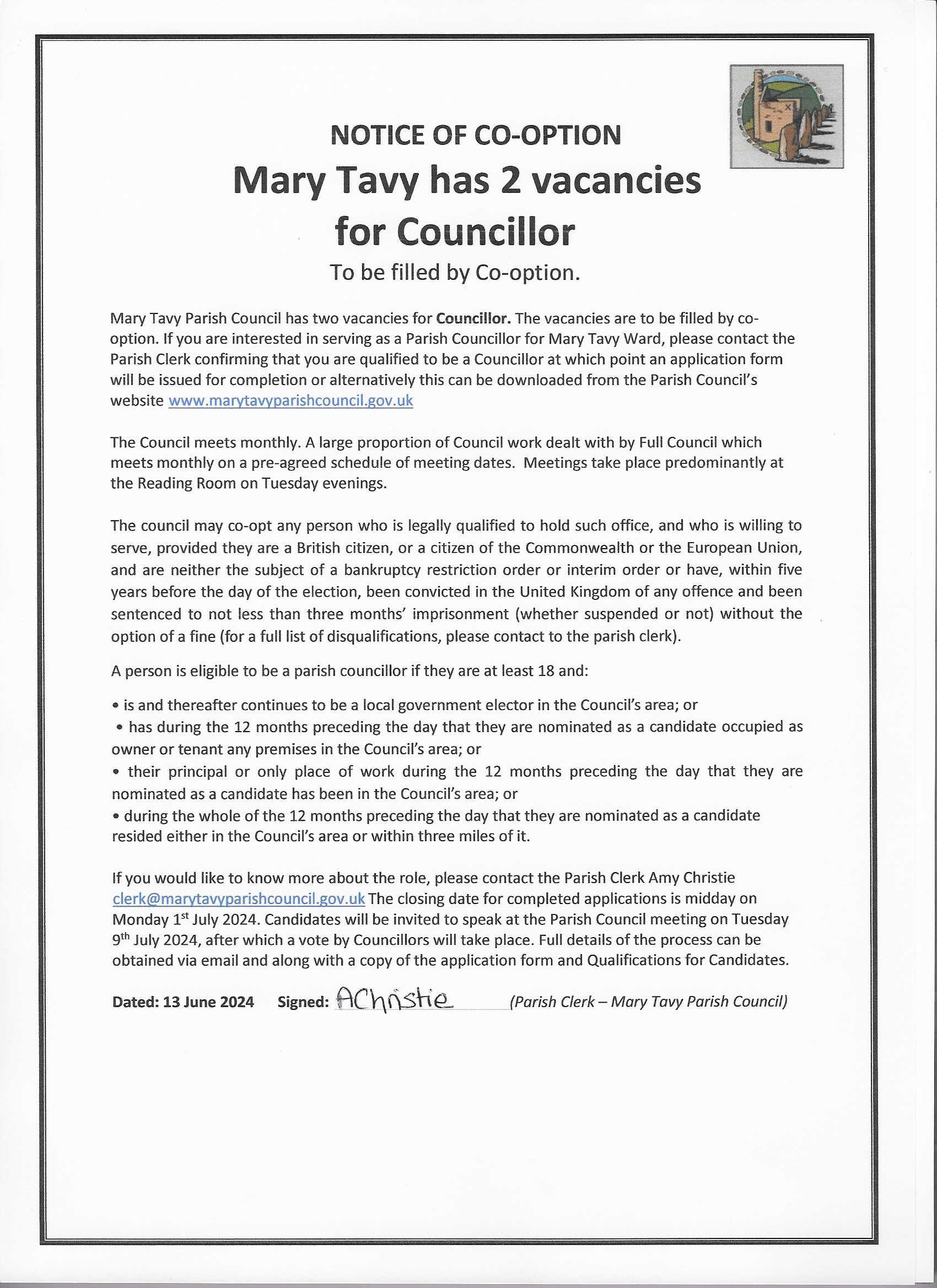 There are currently 2 vacancies for councillors on Mary Tavy Parish Council, following recent resignations (both councillors are moving out of the area). If you are interested in joining the council, please read the information in the attachment below to confirm that you are eligible and then contact Amy Christie, our Parish Clerk, for further information (email or use the Contact Form on this website).