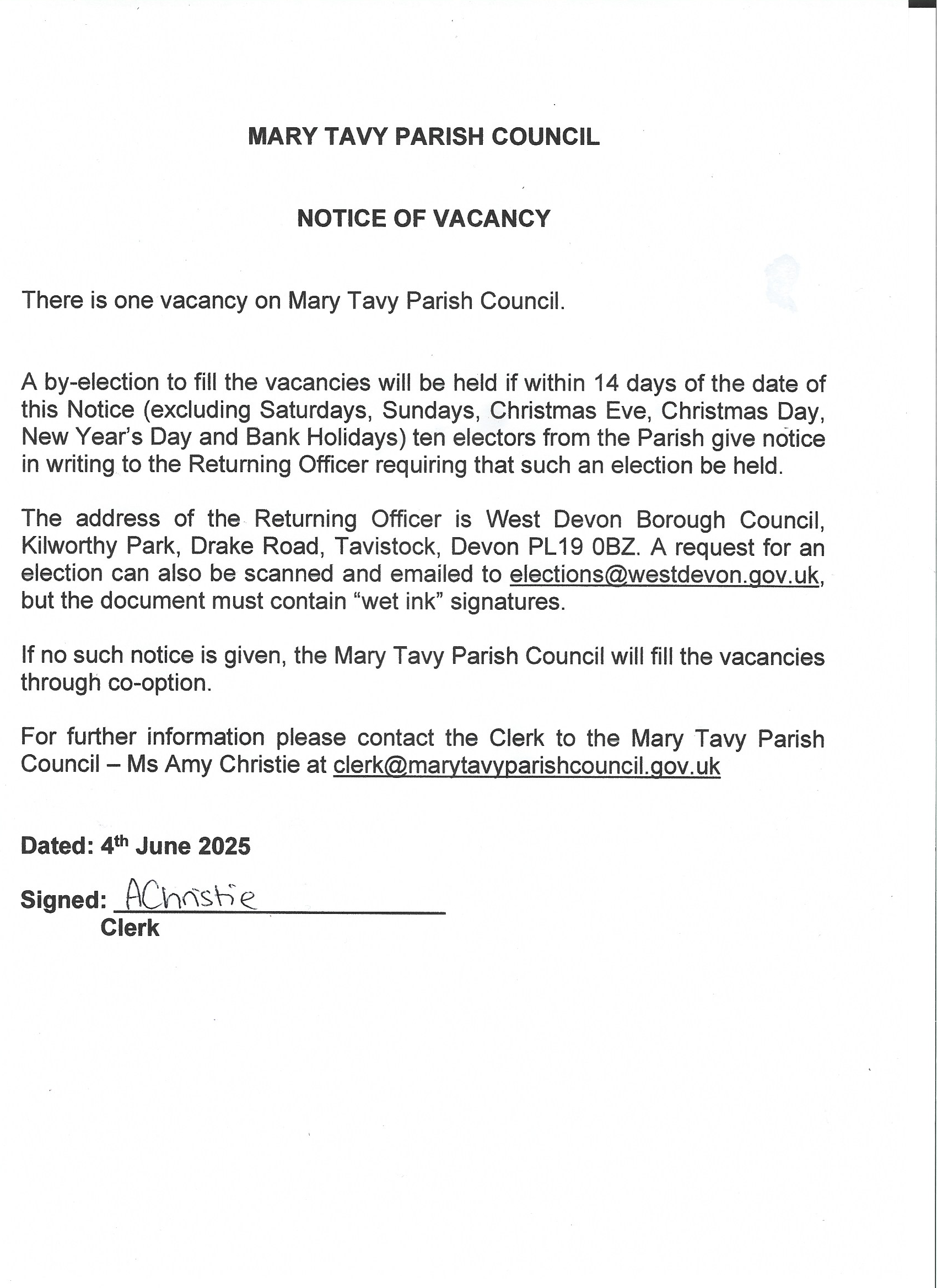There is a vacancy for a councillor on Mary Tavy Parish Council. For more information please see the attachments or contact Amy Christie, Parish Clerk by email ()